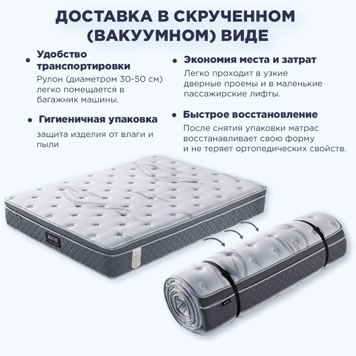 ✓ Умная доставка в вакуумной упаковке (roll pack): Матрас поставляется свернутым в компактный рулон, что: